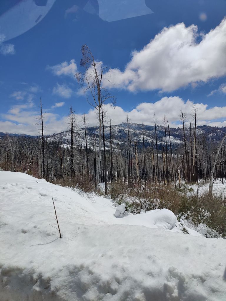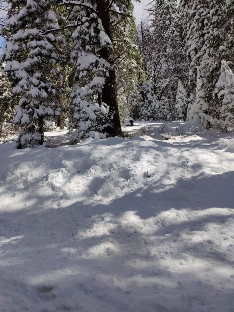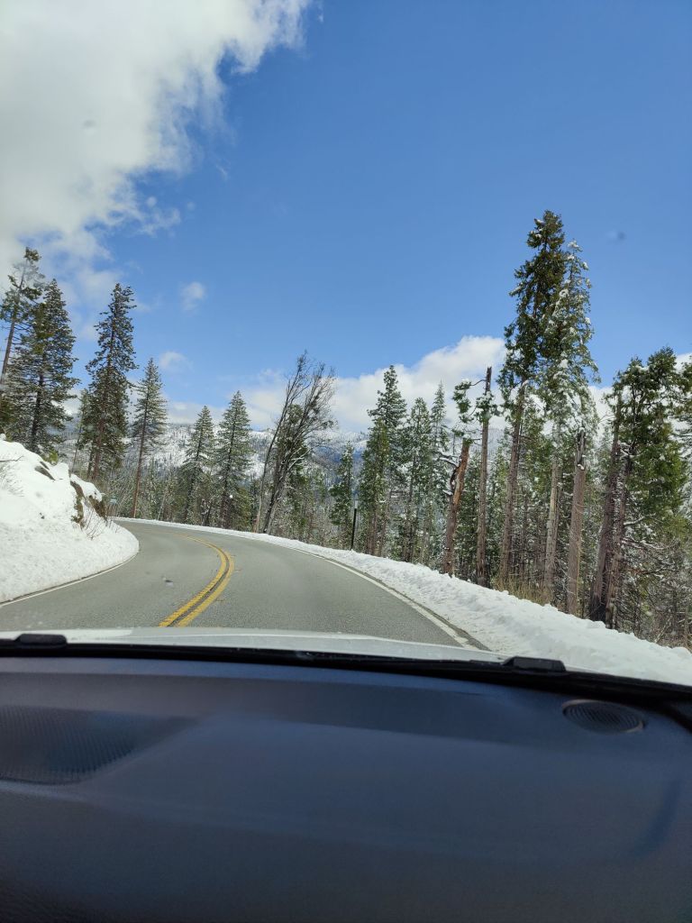We were determined that a fall of unexpected snow would not stop us visiting Yosemite. We made a call and things had improved and tyre chains were no longer necessary. Packed up we had breakfast – if Janice doesn’t get at least 2 cups of tea in the morning she’s dangerous to approach. We set the sat nav for Yosemite, crossed our fingers and toes and said our goodbyes to Fresno.