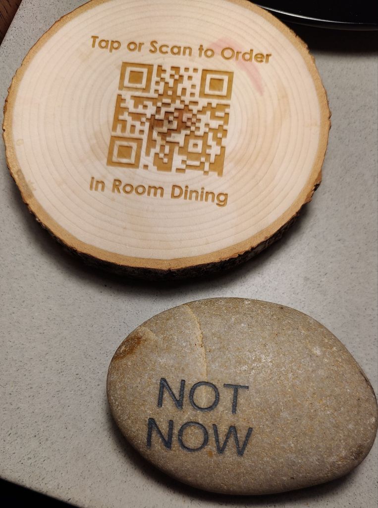 Being a plastic free hotel all qr codes/ instructions are written on wooden blocks and if you don’t want to be disturbed in the morning the above rock should be placed on a ledge outside the room.
