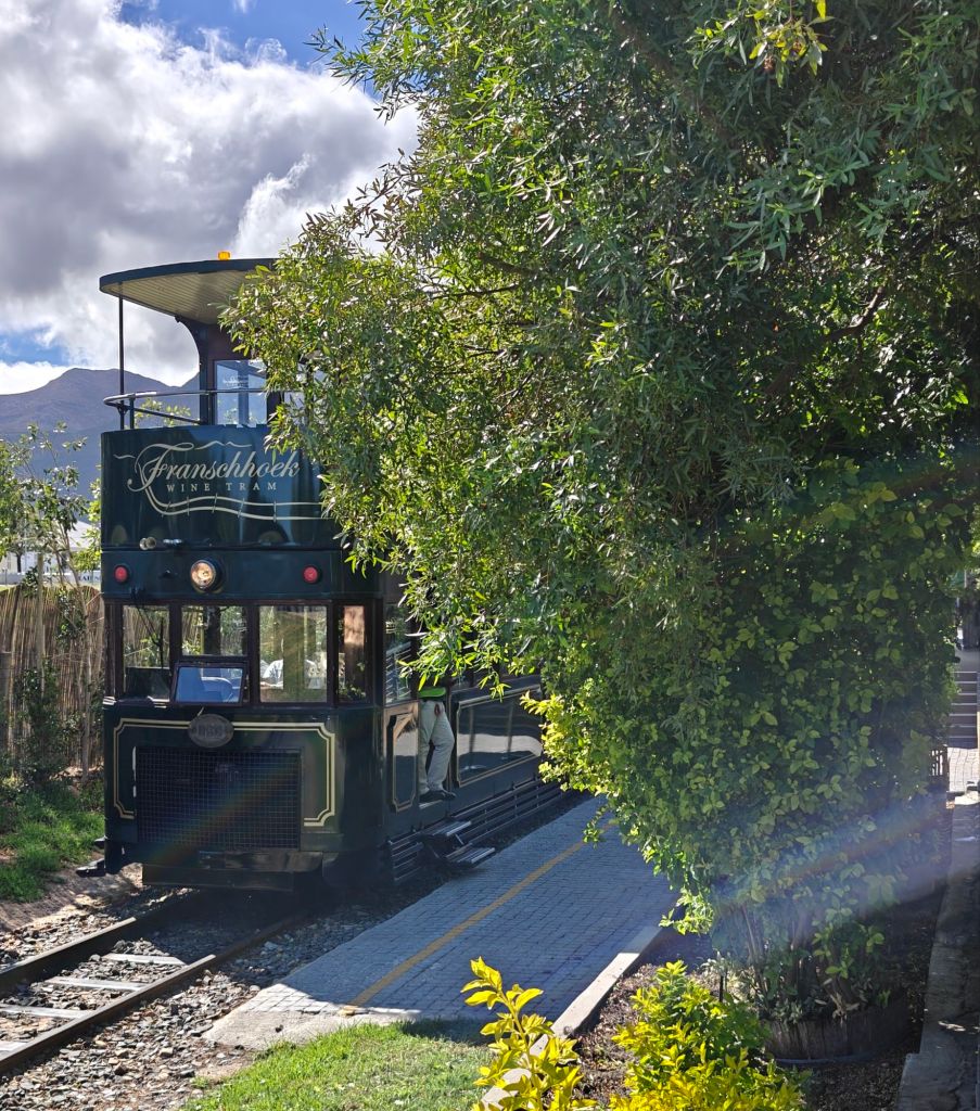 We left Cape Town early by taxi and drove the 50 miles east to Franschhoek. It is flanked by the Drakenstein mountains on 3 sides and was established formally in 1860, 200 years after the French Huguenot refugees settled. It is a lovely place of French Heritage and Cape Dutch architecture but what mostly attracts the tourists is the wine. This area is famous as the Cape Winelands housing over 500 wineries. The first vines were planted by the French in 1688. The Wine Estates are vast and now 30% are foreign owned – Richard Branson has an estate here.